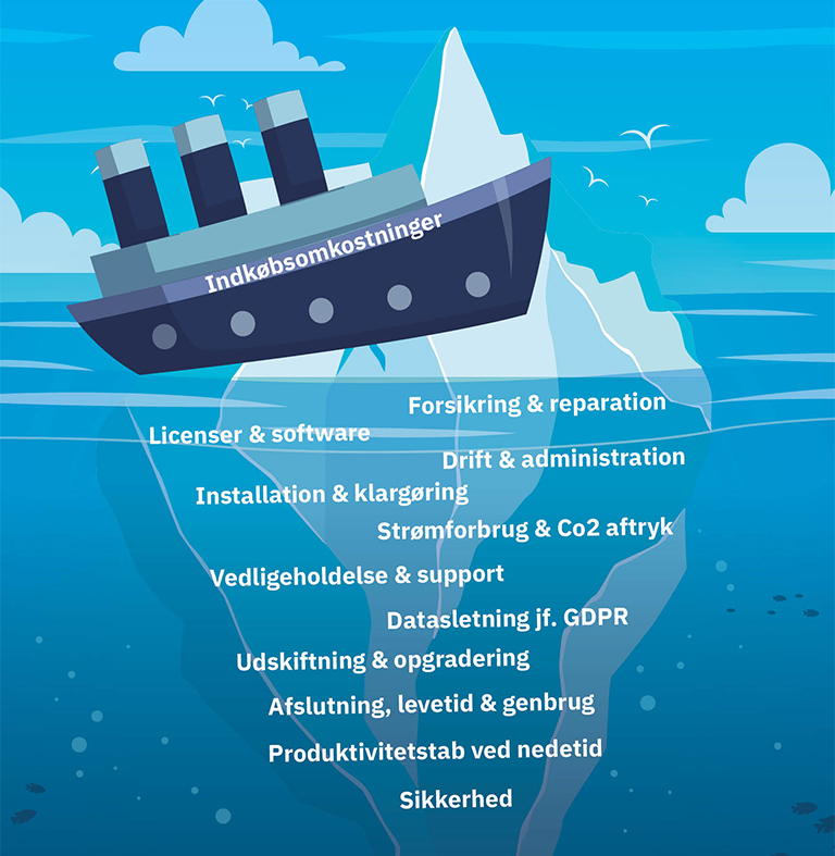 IT-investeringer er som et isbjerg, hvor du kun ser toppen. Vores dybdegående TCO-rapport er baseret på en omfattende spørgeramme, der også belyser alt det, du ikke kan se. For først når vi får alle tallene for jeres aktuelle PC-drift – fra vugge til grav – på bordet, kan vi se præcis, hvor der er penge at spare. Det er der nemlig.